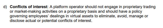 또한 "플랫폼 운영자"를 사업체가 아닌 관련 단체로 광범위하게 정의하고 있어 FTX/알라메다 또는 바이낸스/메리트 피크와 같은 구조도 허용되지 않을 것입니다.
